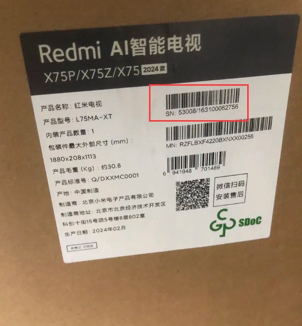 安装实施特定型号设备获取小米电视的序列号(SN)On this page获取小米电视的序列号(SN)外包装的产品标签在小米电视的原始外包装上的产品信息标签中查找SN。电视机背面的产品标签查看电视机背面的产品标签。由于小米电视型号众多,SN的具体位置可能稍有不同,下图是参考示例。⚠️ 提示:通常位于电源接口附近或机身底部。 小米电视的设置信息打开小米电视,使用遥控器选择并进入【设置】->【关于】->【设备信息】向下滚动找到【序列号】。如没有可快速连击"确认"10次,看是否会出来其他界面或SN